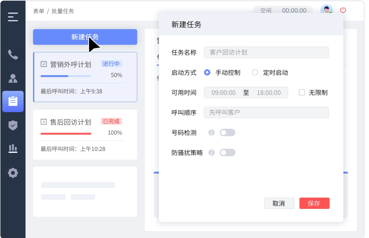 支持excel模板批量导入客户数据创建外呼任务,自定义表单外呼任务规则,实现定时、定量自动外呼。