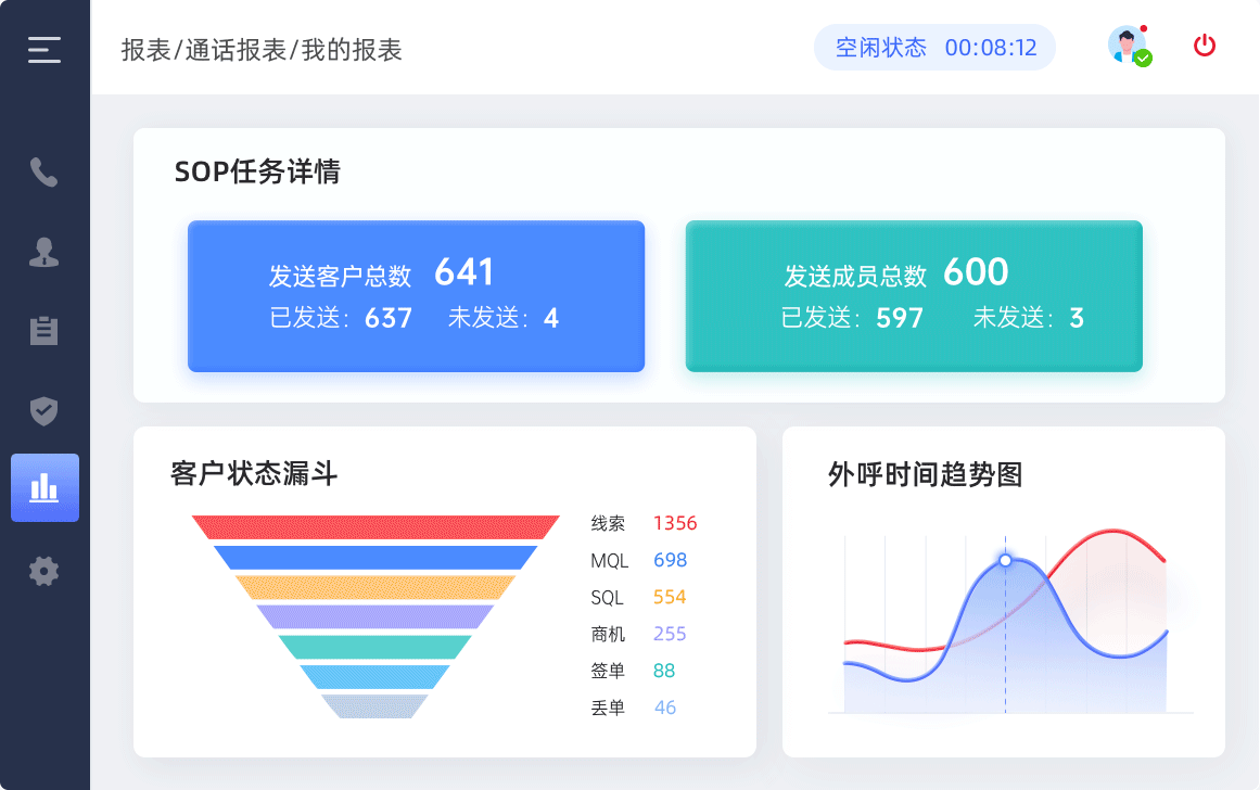 高效外呼平台,支持一键拨号或者设置批量任务,执行大量外呼任务,从而促成产品销售,增加销售机会。