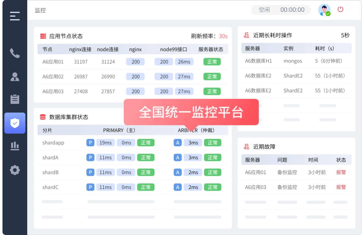 拥有全国统一IDC数据存储中心和7X24h全国统一监控平台,故障预警实时处理。还提供完善的灾备方案,应对通话设备故障、网络瘫痪、线路故障等情况,保障业务稳定安全运行。